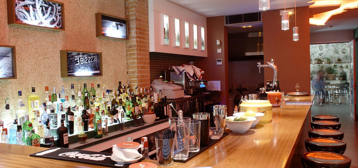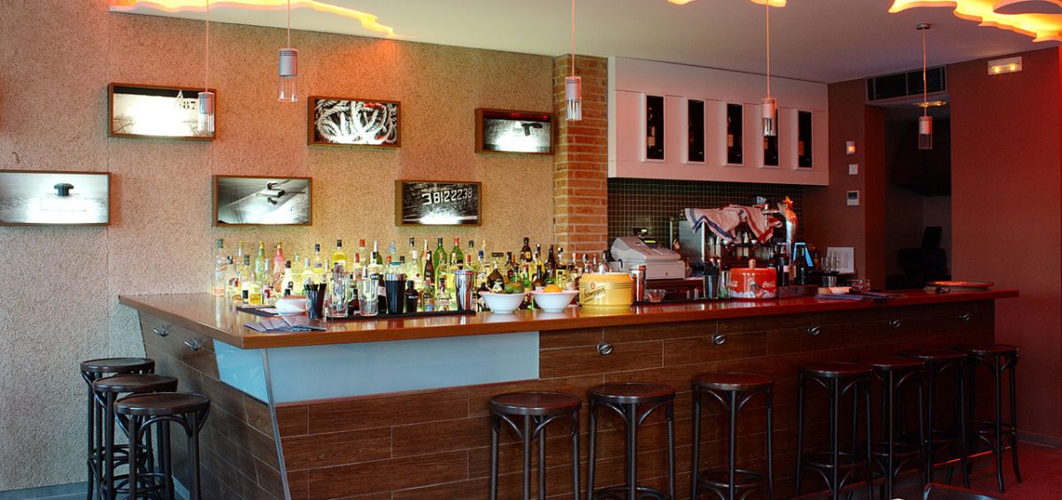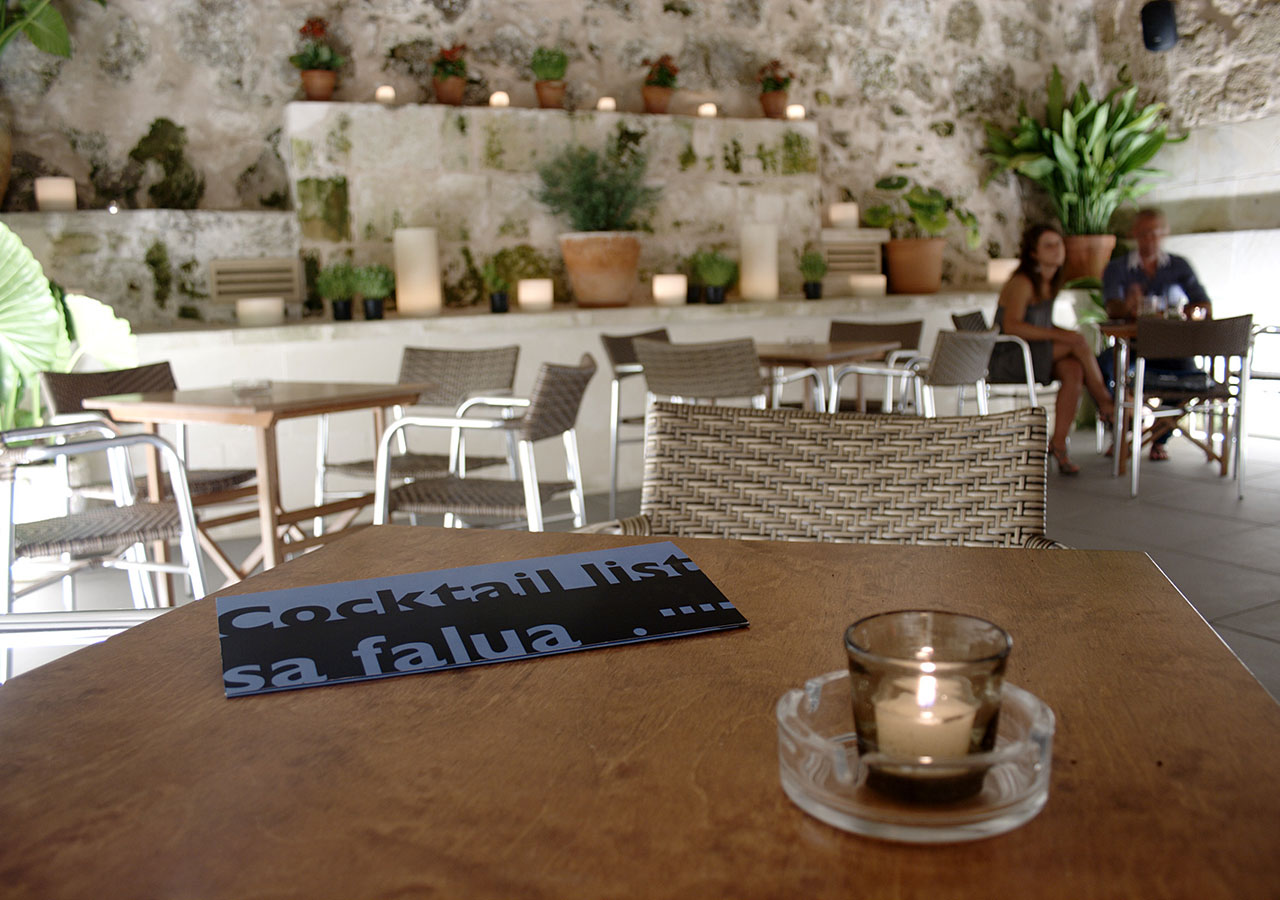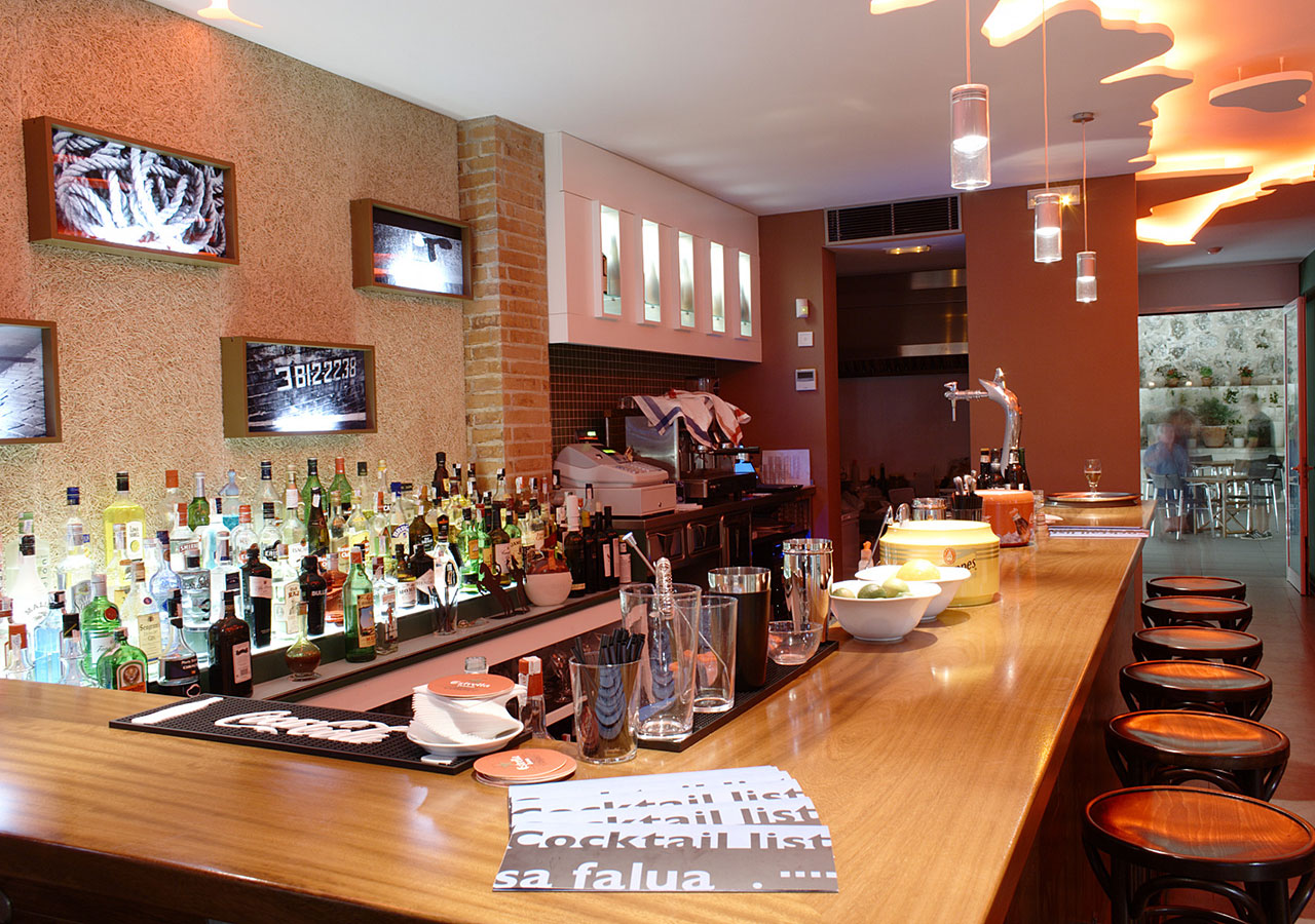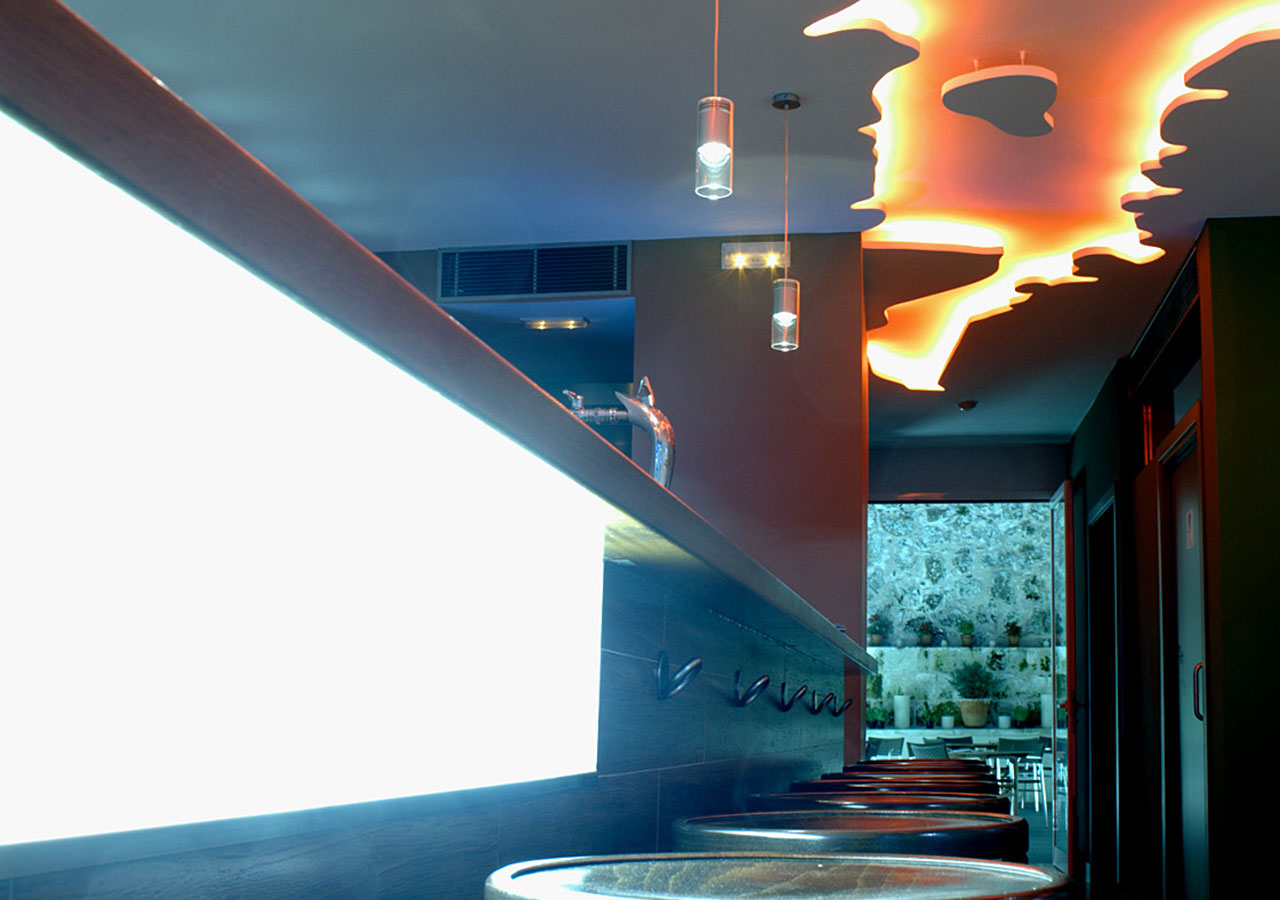 LA MATERIALIZACIÓN DE LA IDEA APORTADA POR PARTE DE LA PROPIEDAD DE REALIZAR UN FALSO TECHO CON EL CONTORNO DEL PUERTO DE MAHÓN Y LA COMBINACIÓN DE MATERIALES, COLORES, TEXTURAS Y FORMAS, COMPLETAN EL PROYECTO DE ESTE BAR DE COPAS SITUADO EN EL MISMO PUERTO DE MAHÓN.