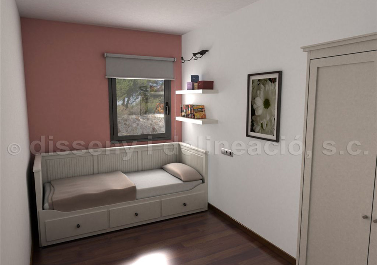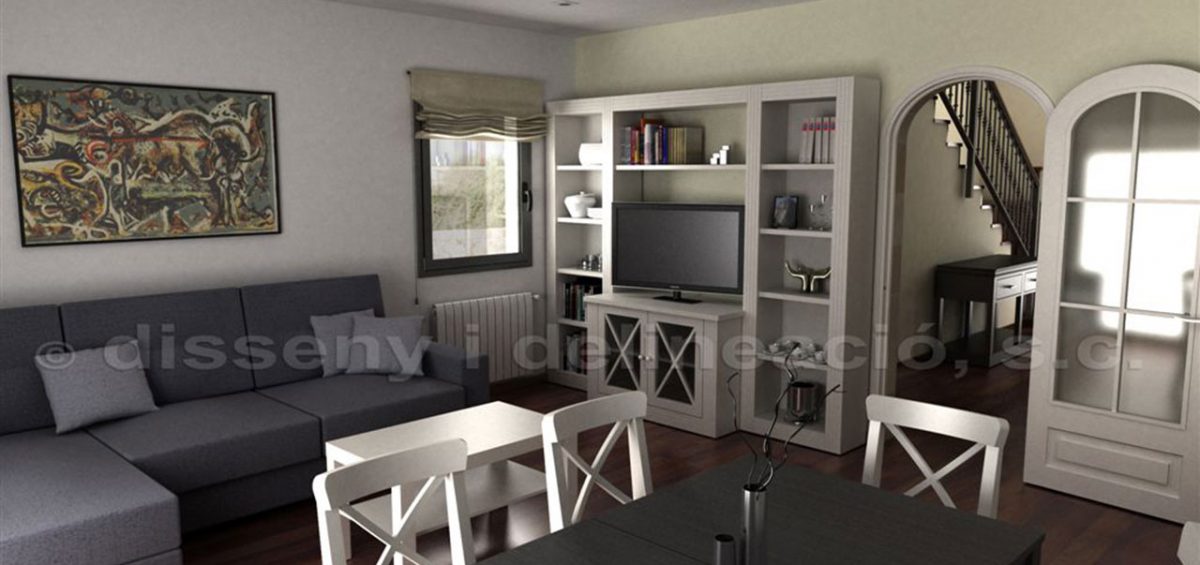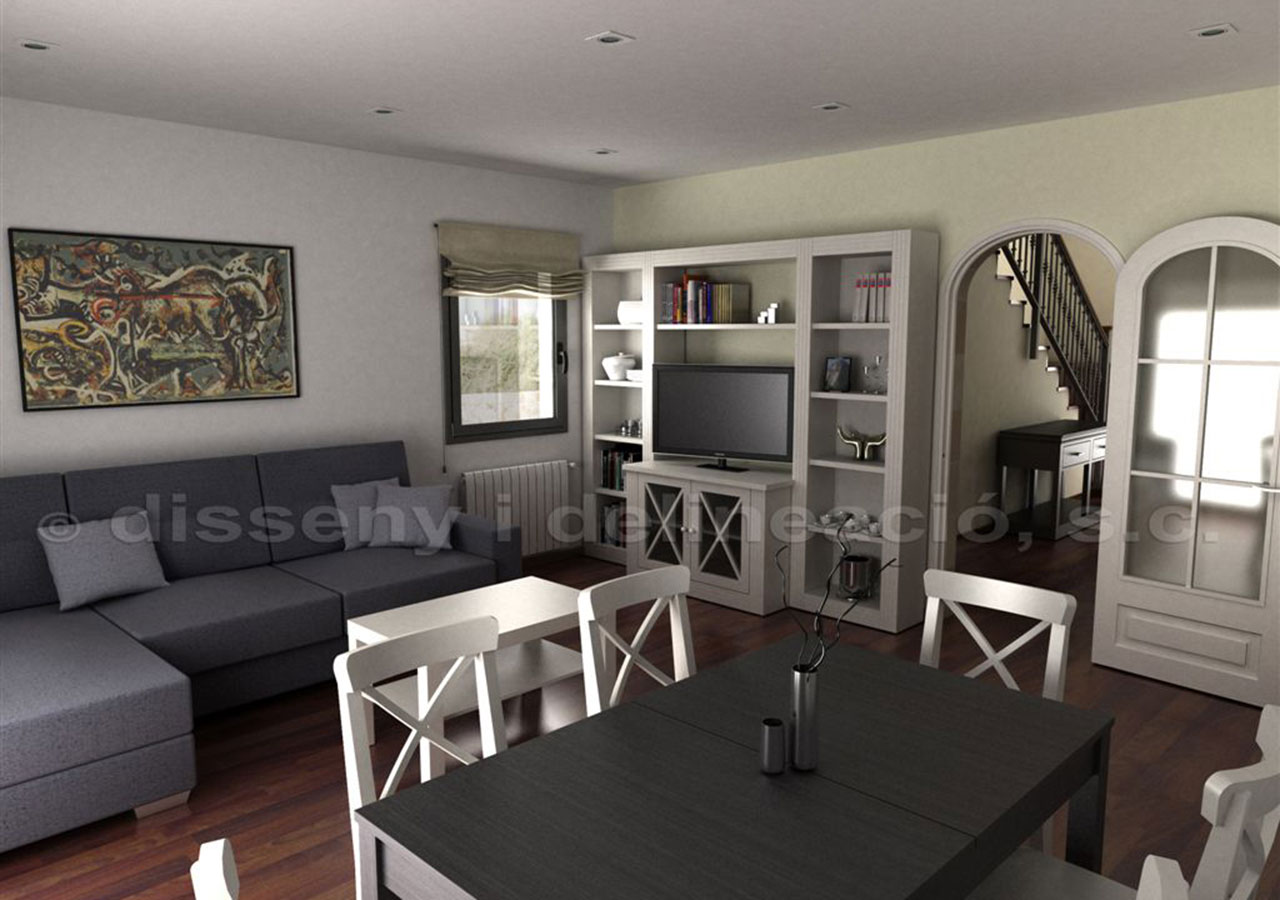 REALIZACIÓN DE UNES IMÁGENES VIRTUALES INTERIORES Y FOTO MONTAJE EXTERIOR DE UNA VIVIENDA UNIFAMILIAR EXISTENTE, EQUIPADA CON EL MOBILIARIO ESCOGIDO PARA ALQUILAR.