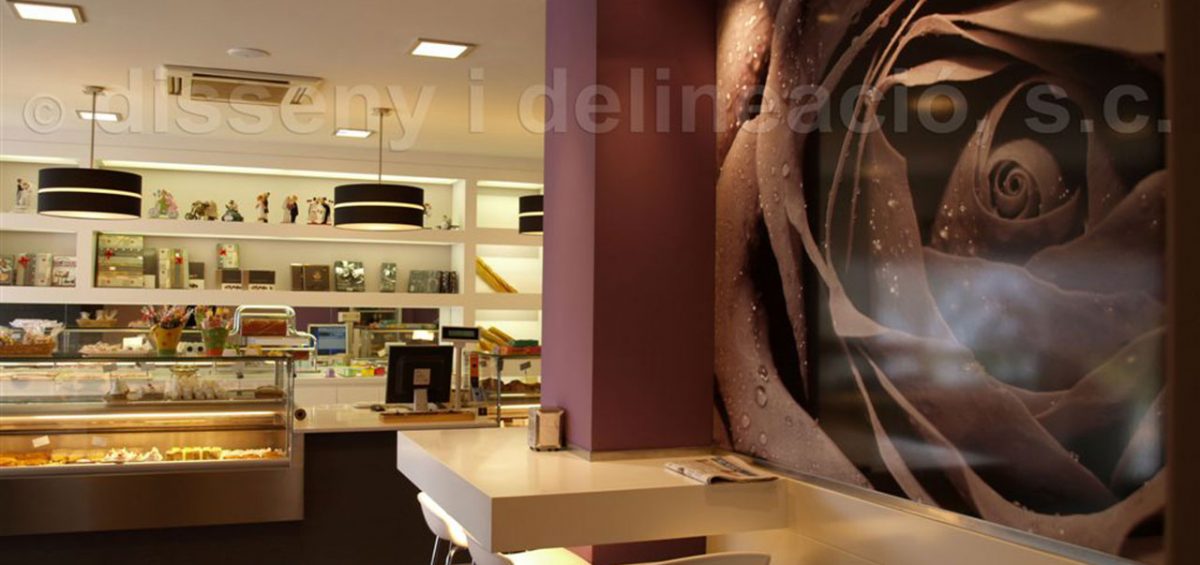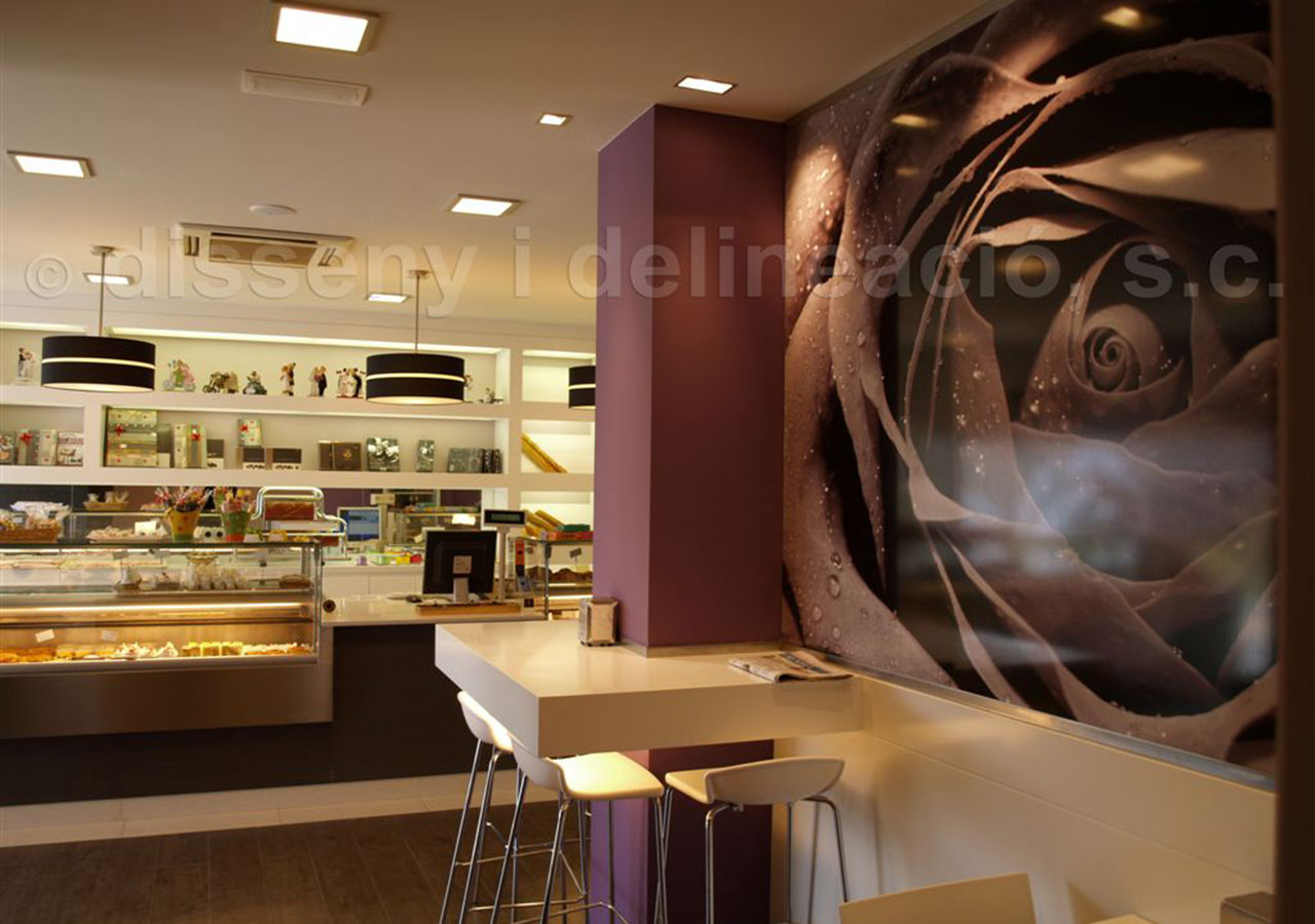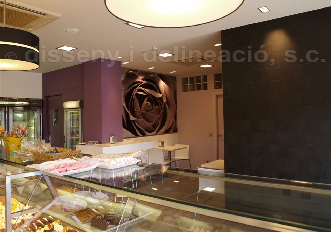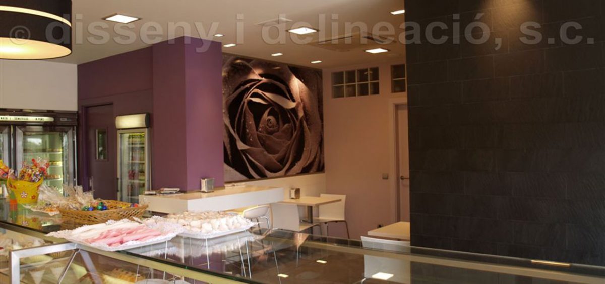EL LOCAL OBJECTE DEL PROJECTE JA ERA UNA PASTISSERIA, EN LA QUE S’OPTA PER DONAR-HI UN CANVI I UNA RENOVACIÓ D’IDEA I D’ESPAI. S’ENGRANDEIX LA ZONA DE VENTA I ES CREA UN PETIT RACÓ DE DEGUSTACIÓ, DIFERENCIANT-SE AMB UN CANVI DE PAVIMENT D’IMITACIÓ A FUSTA. CONTRASTEN ELS COLORS ESCOLLITS PER LES PARETS, PERSONALITZANT EL LOCAL I INTENTANT DONAR-HI UNA AIRE DISTINTIU QUE DESTAQUI EL PRODUCTE.